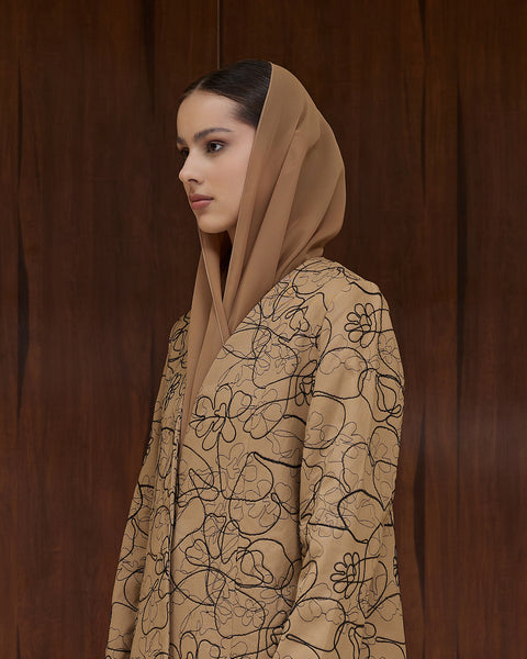 - Decorated with continuous dark brown floral embroidery across the full surface, forming abstract line-art florals