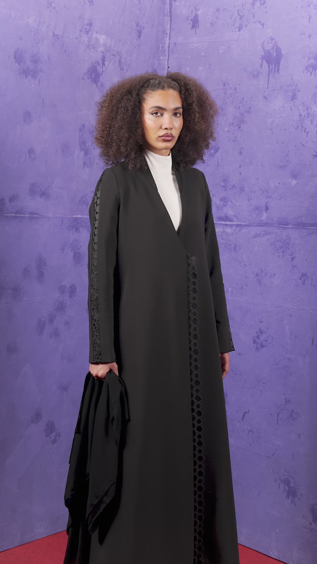 -Structured matte crepe with a clean drape -Tailored blazer-style neckline -Tonal raised circle trim along the front opening and sleeves -Hidden magnet closure at the front -Back side slit -Blazer cut measurements -Normal chiffon scarf