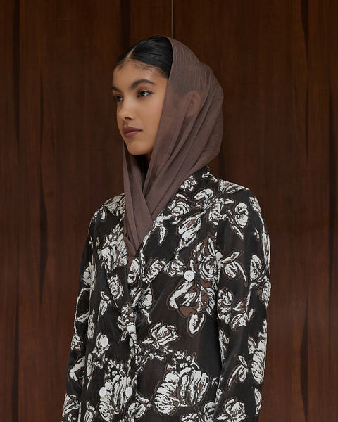 -Printed with large ivory floral motifs over a deep charcoal-brown base, creating dimensional contrast