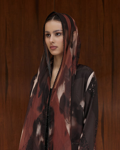 -Digitally printed surface in terracotta, espresso brown, and muted ivory abstract tones resembling dispersed pigment patterns