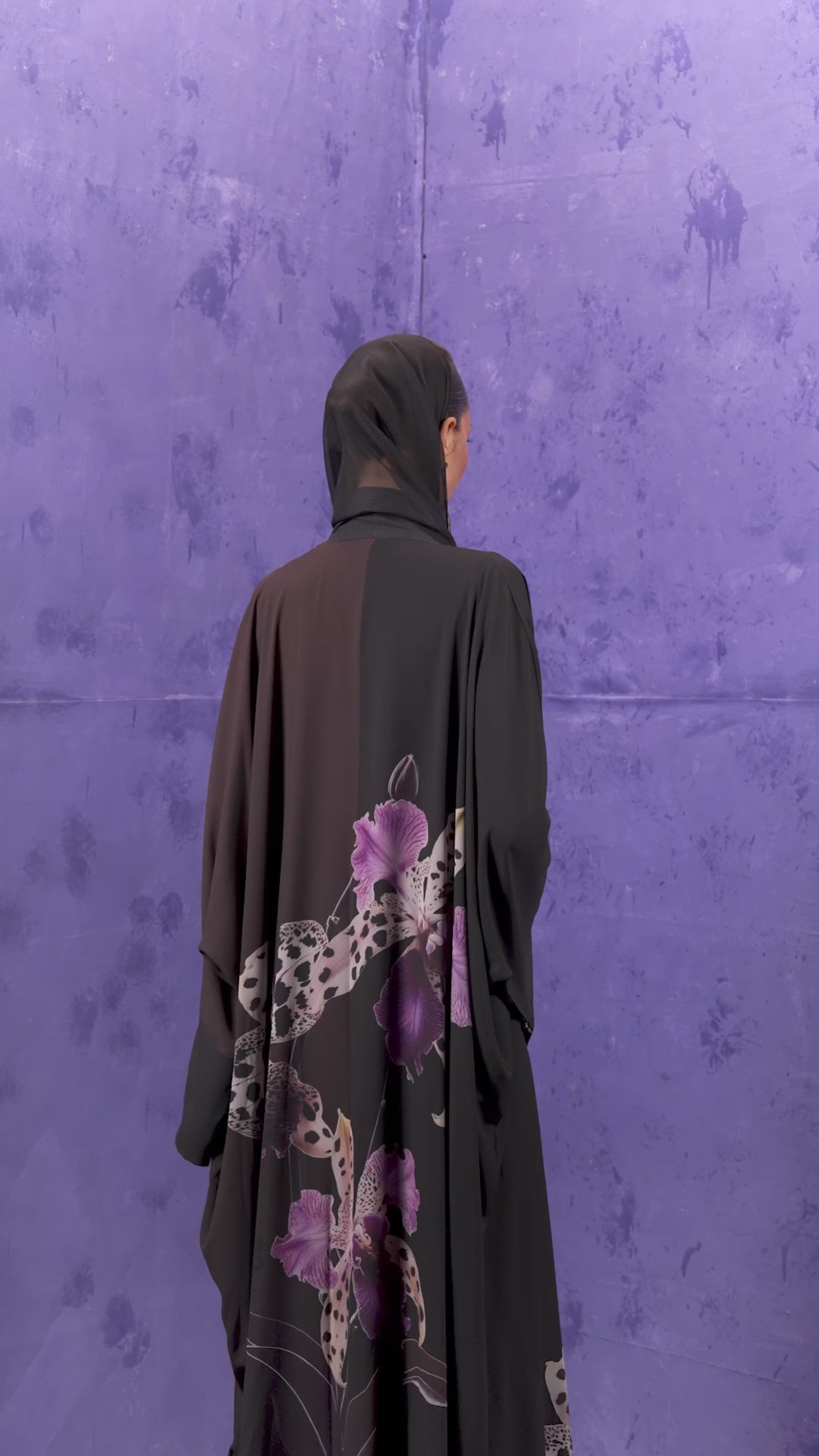 -Open abaya with color-blocked panels in espresso brown and charcoal black