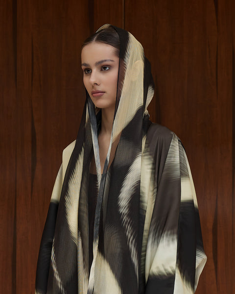 -Abstract zebra-inspired gradient print blending black, light yellow, and sand tones across the surface