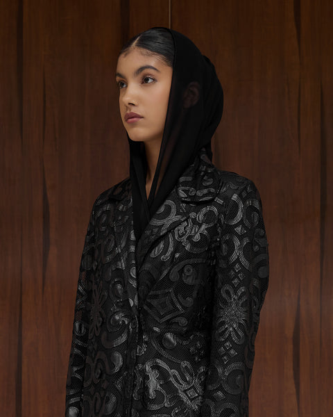 -Tailored blazer-cut abaya crafted in embossed leatherd jacquard