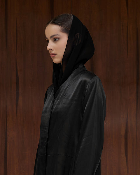 -Full-length open-front abaya with a clean, uninterrupted front line and a soft V-shaped neckline