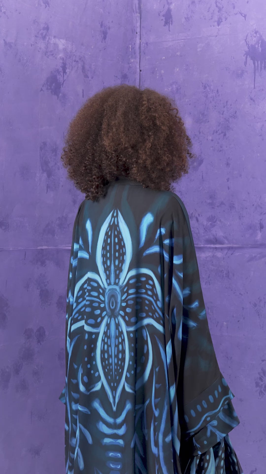 -Matte Black with blue design base featuring tonal flocked-style print in organic forms along the front panels, cuffs, and lower hem