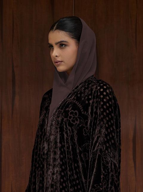 Crafted in burnout velvet (devoré) featuring a mixed polka-dot + floral motif placed across bodice, sleeves, and hem
