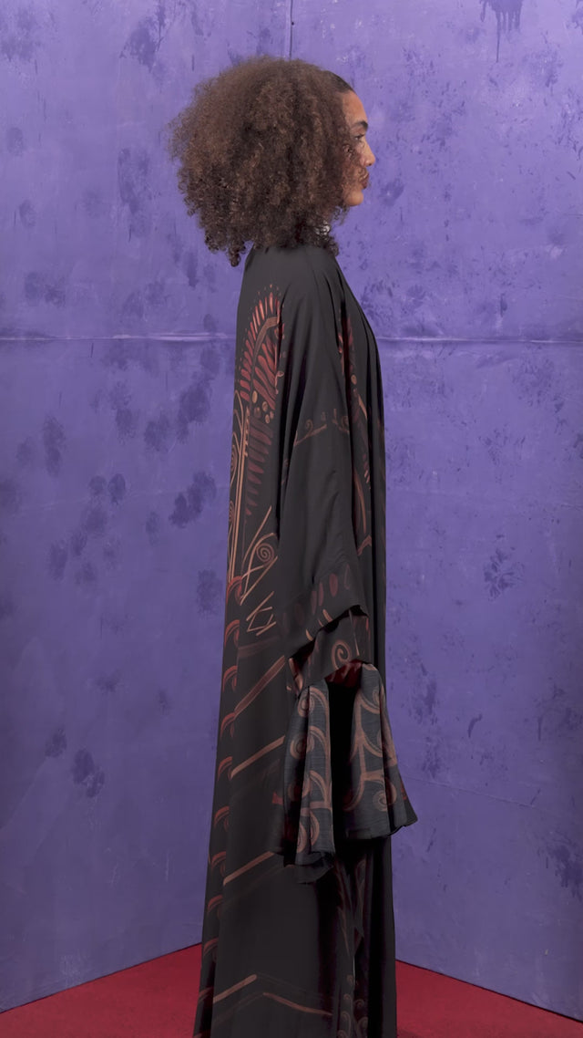 -Full-length open abaya featuring a bold and dramatic architectural motif across the back, sleeves, and front panels