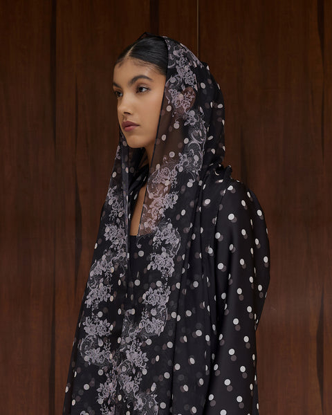 -Close-front abaya featuring a contrast mix of polka dots and lace embroidery print closure by magnets