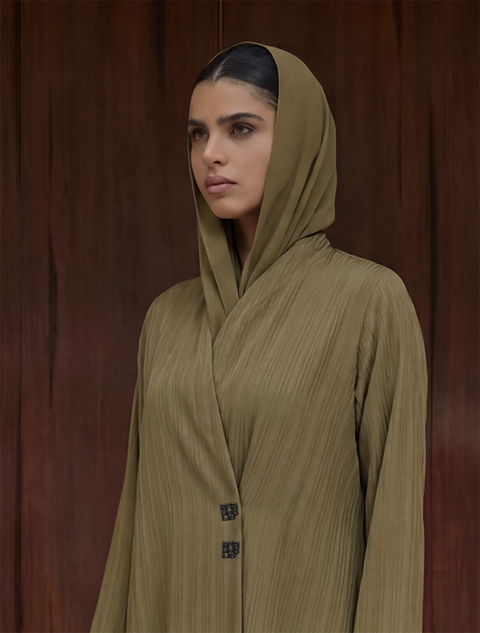 Full-length abaya in matte olive with subtle vertical pinstripe texture