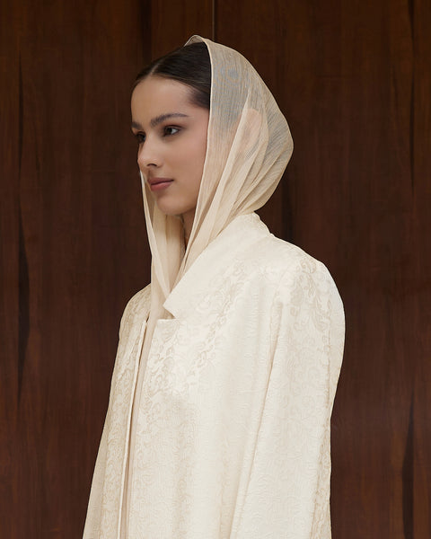 -The abaya maintains a smooth front line with long, gently flared sleeves for a refined architectural form. Designed for minimal volume with fluid movement. Styled with a solid black chiffon scarf for contrast.