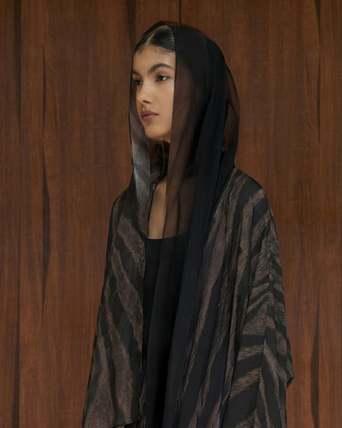 Full-length open abaya featuring a spiraled tiger-stripe motif that wraps organically around the body, creating a fluid, continuous pattern from shoulders to hem.