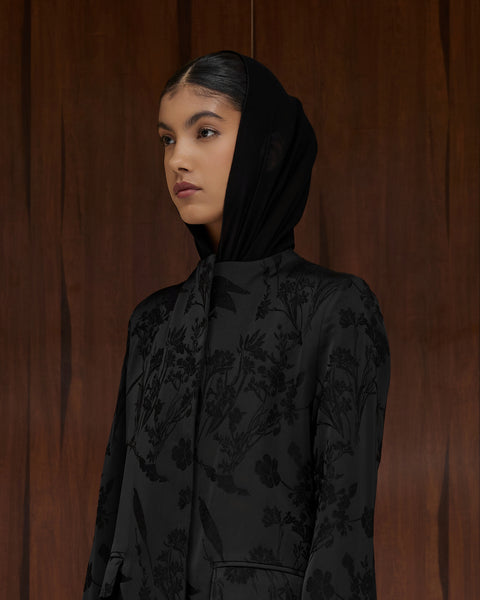 Features decorative welt pockets for added definition without compromising the abaya’s fluid line